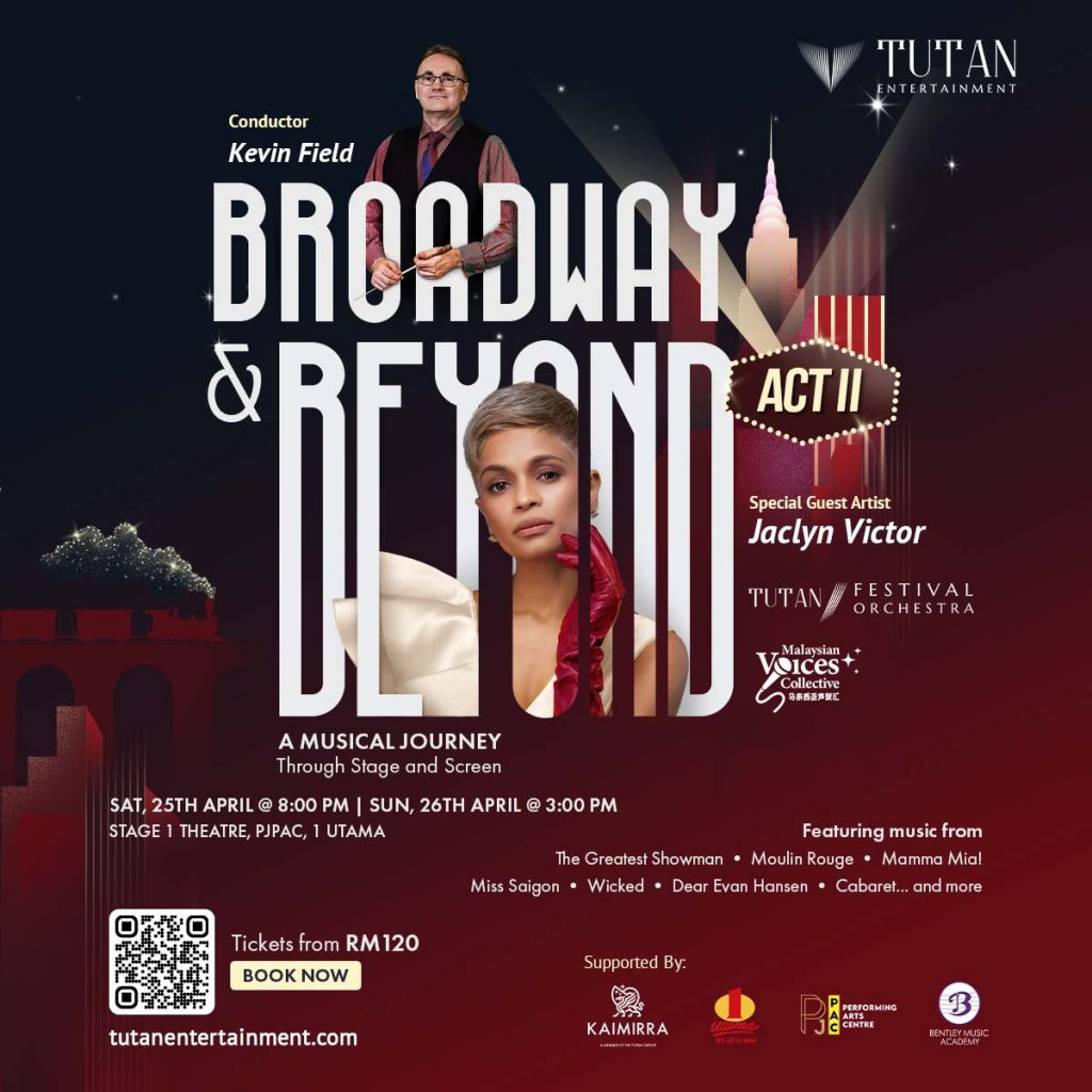Broadway & Beyond Act II is a symphonic concert that celebrates some of the most iconic songs from Broadway and beyond, presented in a refined orchestral setting. Featuring Jaclyn Victor alongside the Tutan Festival Orchestra and Malaysian Voices Collective, the programme brings together powerful vocals and richly orchestrated arrangements that highlight the musical depth, emotion, and craftsmanship of stage repertoire—reimagined for the concert hall.